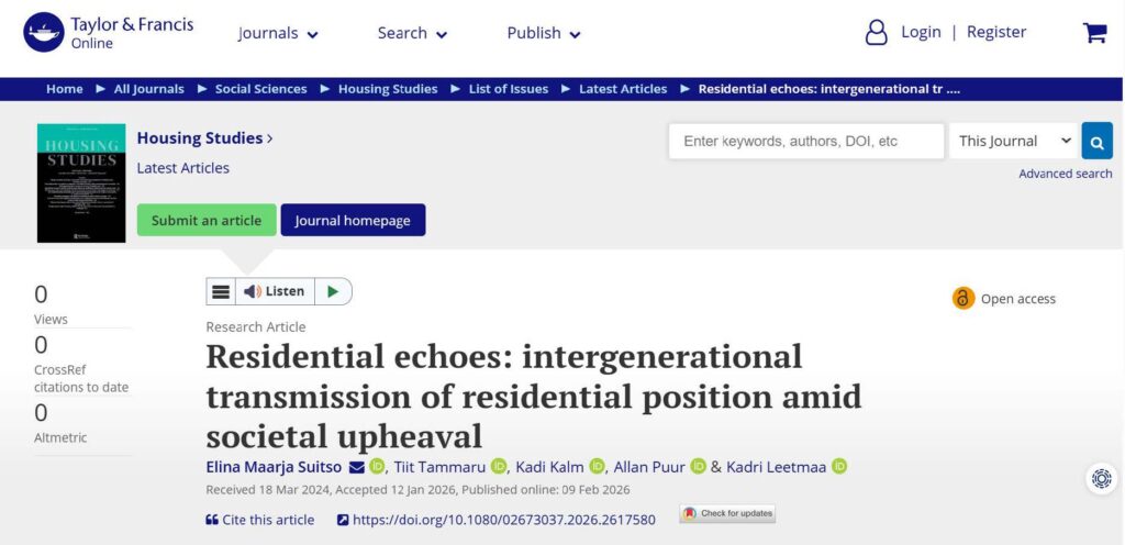Rahvusvahelised põlvkondadevahelise eluaseme-ebavõrdsuse uuringud kinnitavad üldiselt vanemate erinevat tüüpi kapitalide ja eluasemepraktikate mõju laste eluasemekarjäärile täiskasvanueas. Varem ei ole aga vaadeldud elukoha-ebavõrdsuse edasikandumist üle suurte ühiskondlike murrangute. Uuring valmis kahe Eesti teaduse tippkeskuse koostöös: Heaoluteaduste tippkeskus EstWell ja Energiatõhususe tippkeskus ENER